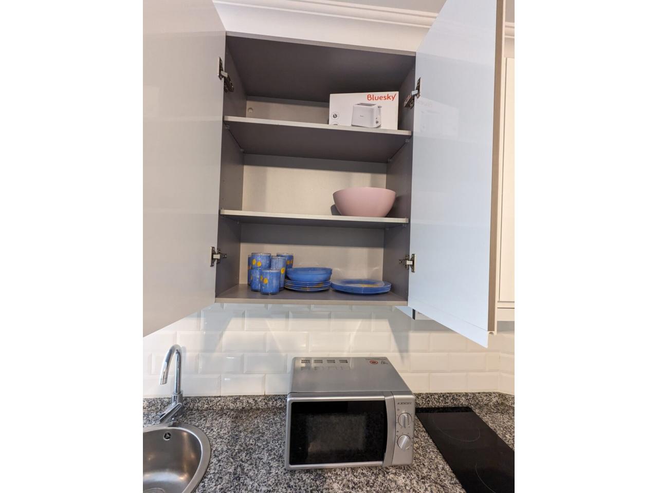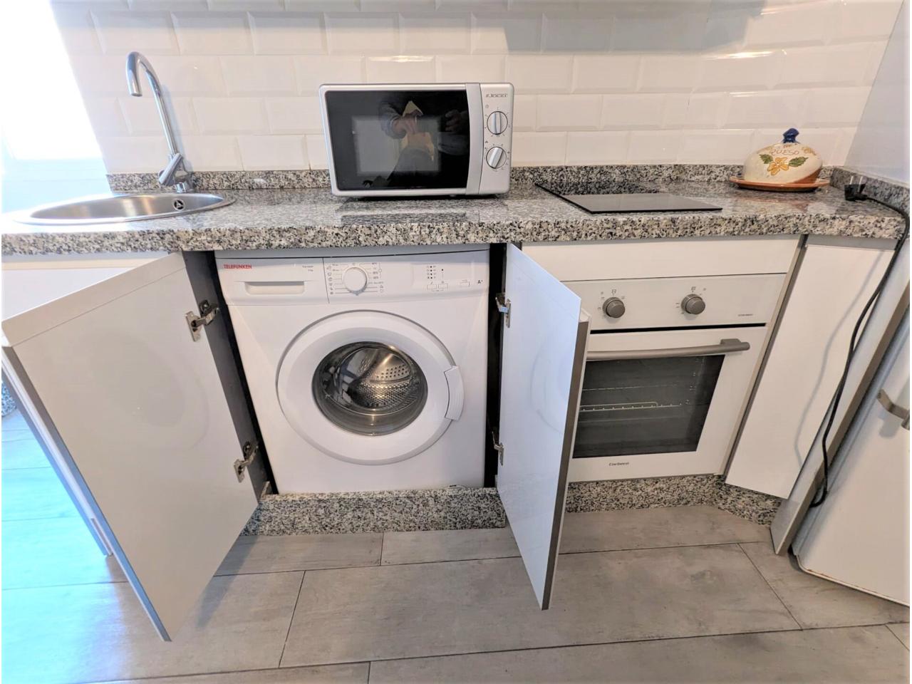 Salón bien amueblado, con TV, pantalla plana, aire acondicionado y Cocina office (equipada, vitroceramica, horno, menaje, microondas, Nevera y termo de bombona de butano)